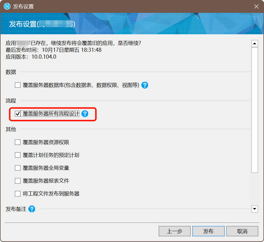 重新发布应用,勾选“覆盖服务器所有流程设计”;